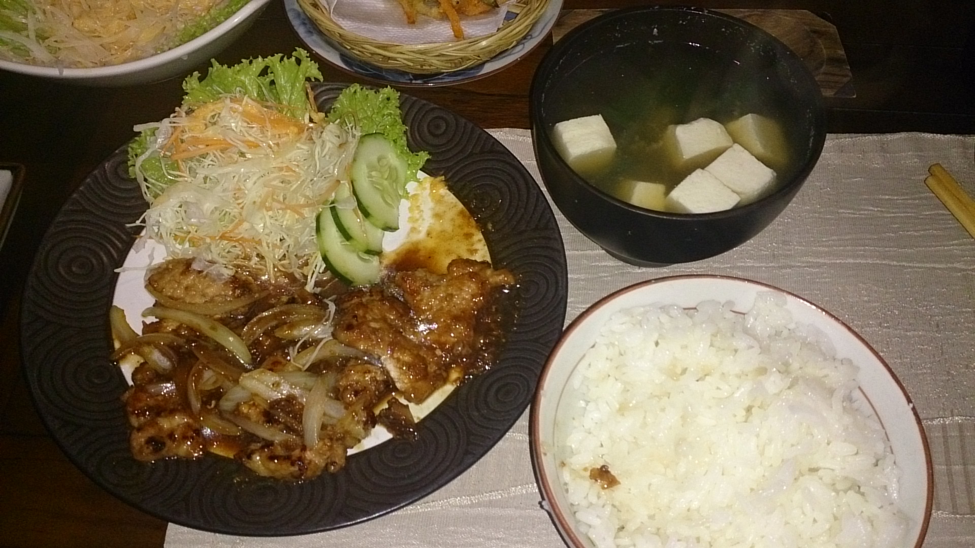 メニューがかなり多くて迷いましたが、おくら玉ねぎ、大根サラダ、だし巻き卵、揚げ出し豆腐、かき揚げ、てんぷらうどん、生姜焼き定食を頼んでみました~(^O^)